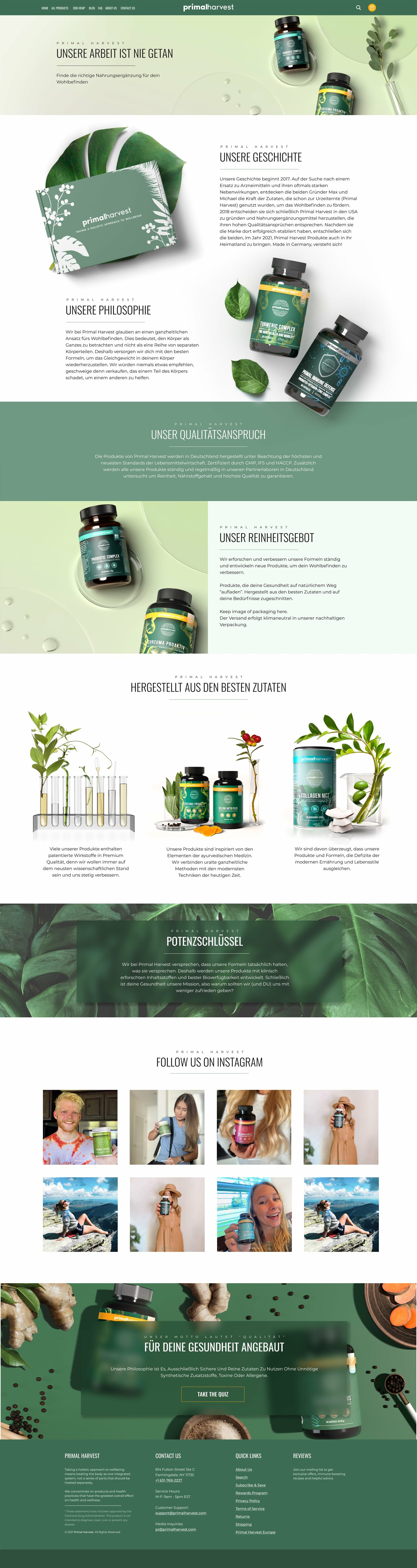 The web design for Primal Harvest was thoughtfully crafted to reflect the brand's commitment to natural wellness while embodying a professional, science-backed aesthetic. The visual style was meticulously designed to reinforce the brand’s credibility and expertise, with elements that echo the purity and efficacy of their natural supplements. Throughout the Shopify store, this blend of natural and scientific visuals is implemented across various sections, creating a cohesive and immersive brand experience. Vizuella was responsible for the entire store design, covering all product pages as well as essential service pages like FAQs, Contact, and more. Each page was designed to ensure a seamless user experience, guiding customers through the brand’s offerings with clarity and elegance.